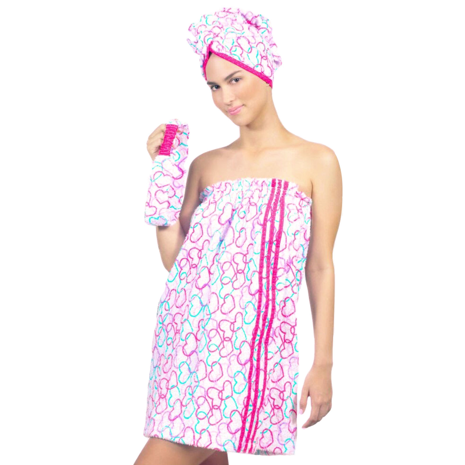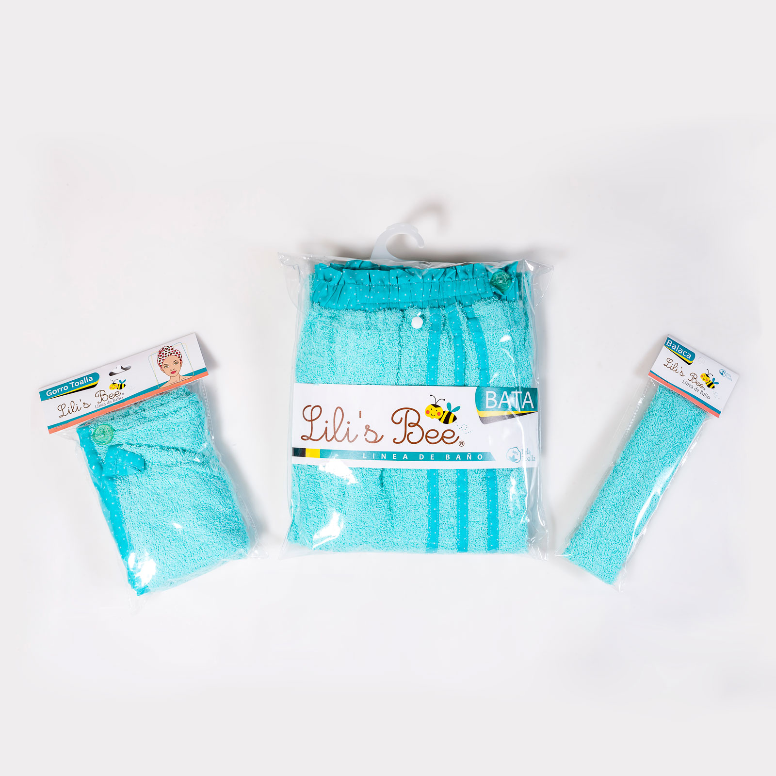 Kit completo para tu cuidado personal después de la ducha. Incluye gorro, balaca y bata en tela toalla de algodón.